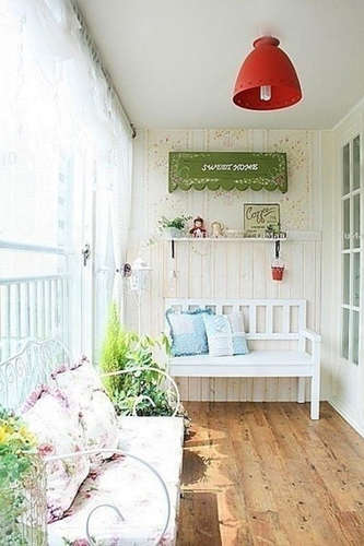小编的话:一看就是女孩子布置的阳台,超唯美超清新,粗糙的木地板自有一番格调,墙上贴了漂亮的壁纸,绿色的挂牌也经过了精心设计,安一块搁板还可以随意放置些小物件来做装饰。既有木质长椅,又有铁艺沙发,彩色的抱枕更能点亮心情,再来点绿色植物,白色的透明纱帘随风舞动,美翻了!
