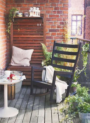 小编的话:户外阳台最能敞开胸怀接纳阳光与和风,装一个遮阳蓬可以防止下雨时雨水灌进阳台,铺上一块手工编织的地毯,摆上两把木椅,再放一张可折叠的小圆桌,几株精心养护的盆栽,天气好的时候在这里喝喝茶、聊聊天、看看天空,想想就觉得舒畅。墙上挂一个铁架来放杂志,借着阳光读读书也是蛮有情调的呢。