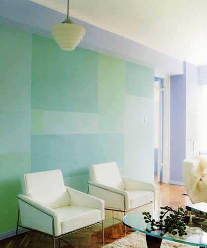 打造要诀:先用铅笔、尺子在墙面描出不同尺寸的方形,直到整面墙打造完毕,刷上颜色,不同一般的手绘墙呈现出来了。如果担心边围涂料处理不当,色彩出现问题,可以考虑用纸片遮挡。