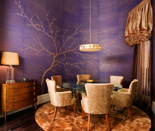 视觉效果:墙面本来底色处理就十分巧妙,紫色满腔但又富有变化,深浅不一的处理让墙面更多看头。原本就戏份很足的墙面,再做精细小巧的手绘就让整面墙愈显饱满。