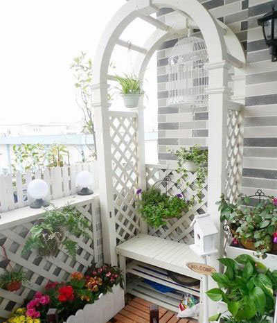 小编的话:不管是地面或是墙面上都摆放满了各种绿植,让这间阳台就像是个私家小花园一般,座位上方圆拱形的空间装饰,不止能够美化这一空间,还能够在上面挂放一些绿植,而座椅下方的几层收纳格可以在平日收纳不少东西在其中。