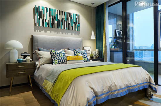 设计说明:宽敞明亮的卧室空间感十足,保证居住的舒适性。现代简洁的家具造型与墙上的艺术画,给居住者带来品质居所的奢华感和汇聚世界潮流前端文化的都会情节。