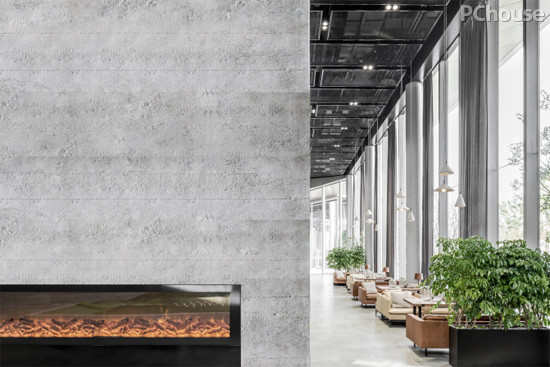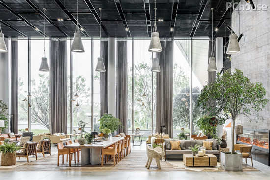 风化打造的山石、自然形成的山脉、岁月留痕的年轮在空间中肆意演绎,大面积使用的清水混凝土、朴实的木材还原自然的朴实。生命之色——沁心的绿让空间充满了活力,营造出了一个与自然同行的蓊郁憩所,在空间中发酵出舒缓闲逸、静定而又悠远的情愫。
