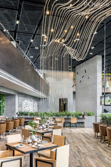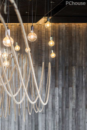 简餐区的上空,一根根柔软的藤蔴悬浮于半空中,如丰收的麦浪在秋风中律动着,荡漾着;其上方的灯具,宛若轻盈的蒲公英,在麦田里尽情飘舞。当人们置身于此时,只觉着心灵分外平静舒畅。
