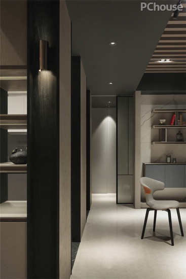 编辑点评:进入主卧场域,左侧为私人区的小玄关端景,右侧为主卧房的独立更衣室。