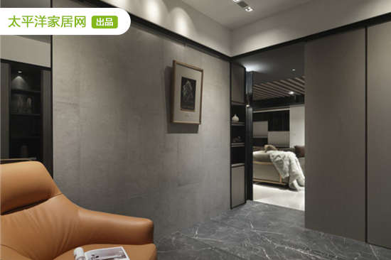 编辑点评:甫进门,玄关使用石材纹的地砖搭配仿清水模灰色墙面,让进出之际都能感受恢弘的气度。