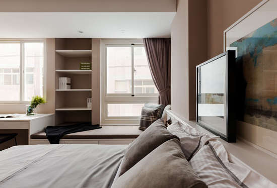 编辑点评:在卧室打造窗台软榻,充分利用了多余的墙角空间,也增加了卧室的舒适度。软榻底部和背景墙的内嵌式空间也大大增加了卧室的收纳能力。
