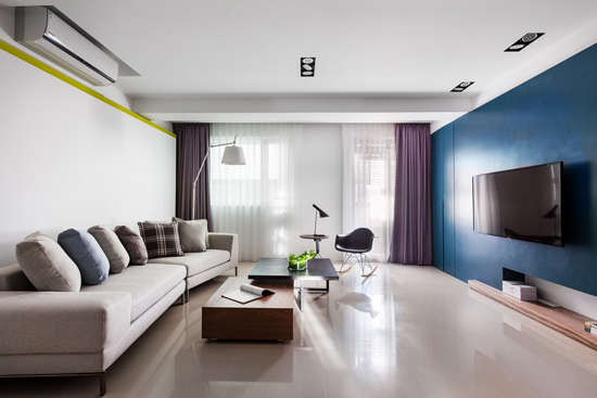 【太平洋家居网 设计频道】这间小清新质感的现代化公寓是为一对新婚夫妇量身定做的,特别的铁蓝色电视墙作为公寓的中心让客厅显得既有活力又不失沉稳。此外,地台、背景墙金属线框和移门等空间隔断细节让公寓的功能区划分清晰,同时也塑造了宽敞舒适的家居氛围。