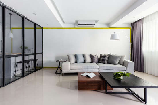 编辑点评:草绿色的金属线框勾勒出背景墙的线条感,还起到了隔断餐厨与客厅的视觉效果,其清新的色调更让空间多了一丝活力。