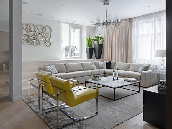 【太平洋家居网 设计频道】这间位于莫斯科市中心的LOFT公寓是为一个五口之家设计的,现代简约风格的公寓把金属、木质和玻璃三种材质巧妙地混搭从而呈现出让人赏心悦目的空间美感。此外,地台升高作隔断、金属圆环墙饰、随处可见的艺术挂画和玻璃书房等细节处理也大大提升了空间的美感与格调,让简约风的公寓也可以优雅的方式呈现。