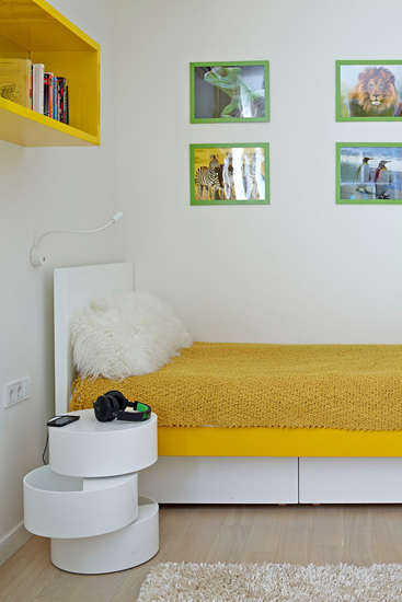 编辑点评:黄色、绿色和白色三种色调的融合充满清新与活力质感,有效地活跃了儿童房的氛围,无处不在的收纳设计让室内显得井井有条。