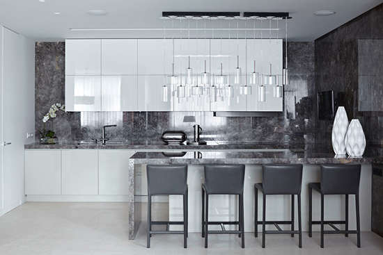 编辑点评:灰色大理石背景墙和吧台使厨房区在公寓中“独树一帜”,大方得体又充满立体感,清晰且有质感的纹理让人对该厨房过目难忘。