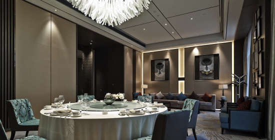 设计亮点分析:餐厅,一直都是酒店室内设计中的重点,是设计师追求完美空间的篇章。不论是从建筑结构到室内装饰都运用了现代新中式的设计风格,还是设计手法上的将古典中轴对称和现代简约的线条形式完美结合起来,都是无可挑剔的。
