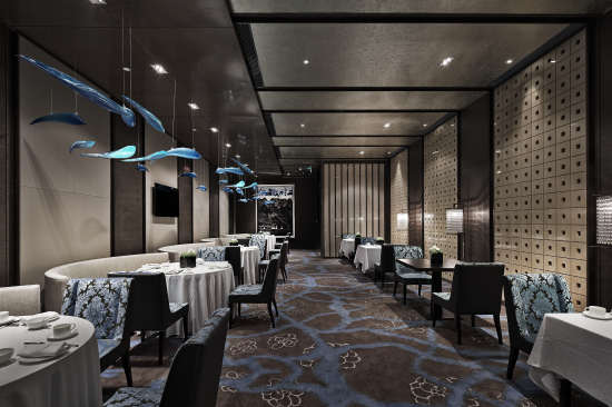 设计亮点分析:济南绿地美利亚中餐区零点餐厅的设计以戏剧化的方式呈现,在令人安静的蓝绿色调映衬下好似中式茶舍,茶艺表演结合优美的背景音乐,醒茶、泡茶、品茶行云流水,一气呵成。
