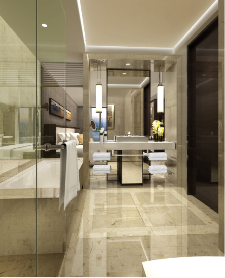 设计亮点分析:标准客房面积达39平米,流线通畅,采光极佳;在采取卫生间与卧室半开放这种布局的户型中,称得上是典范之作。其中,很多贴心好用的细节设计,带来无为不至的呵护。迷你吧利用靠窗空间,设置了迷你吧,把原本的交通空间变成功能区,和电视机背景墙连为一体,一起呵成。嵌入式的电视机可以拉出并旋转,无论在书桌旁、沙发上,都能舒舒服服地观赏。