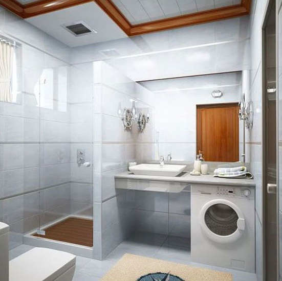 编辑点评:把洗衣机放置在洗手台平台下方,大大地节省了卫浴的空间,也保持了外观上的整洁。大面积的方形镜子从视觉上扩大了空间感,玻璃门和吊顶的棕色木条让空间色彩不再单调。