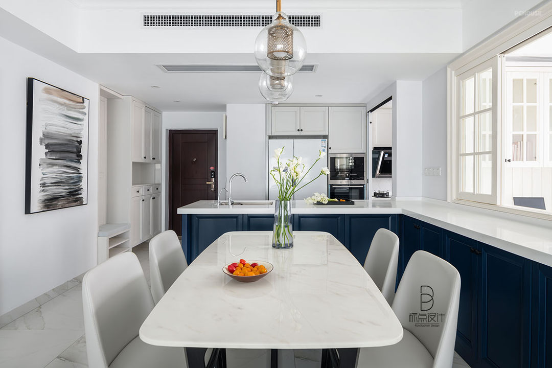 入门,从西式厨房、餐厅看向客厅,格局通透流畅。不着痕迹的自然色墙面,大理石纹路的地面,被宠爱的靛蓝,在视觉上依次丰满。