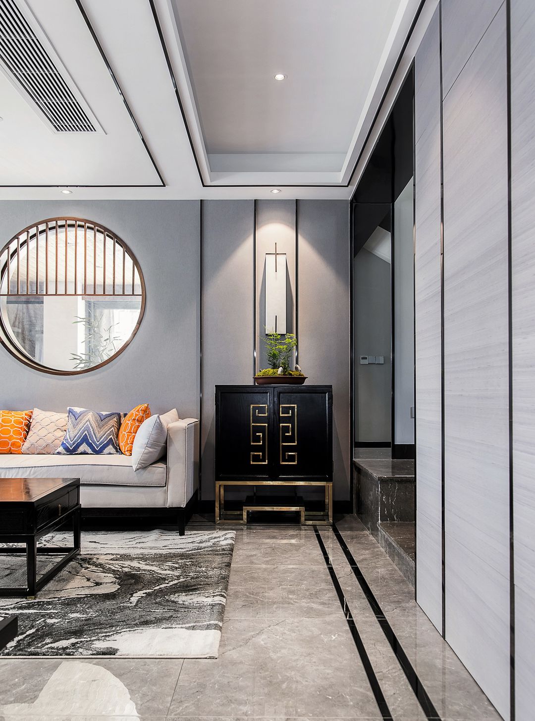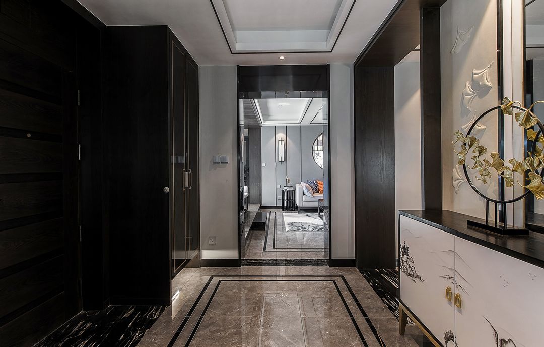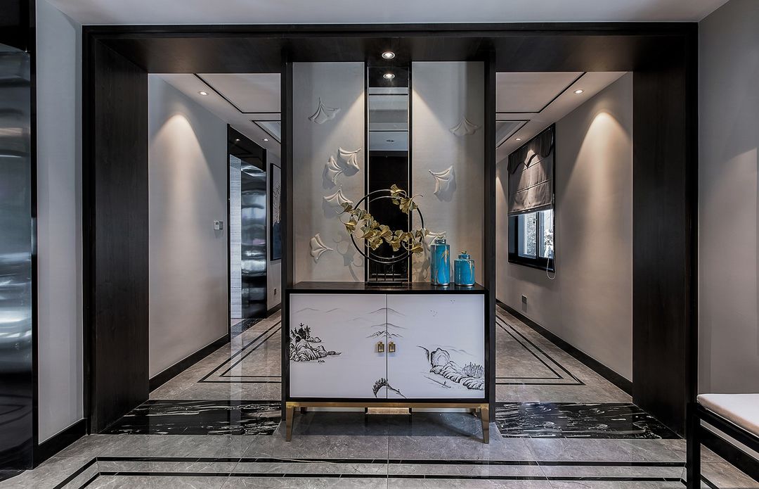 玄关的门套是用KD板加硬包的设计,中间做了一整条的镜子,后期设计师选的软包,整体非常协调舒适。