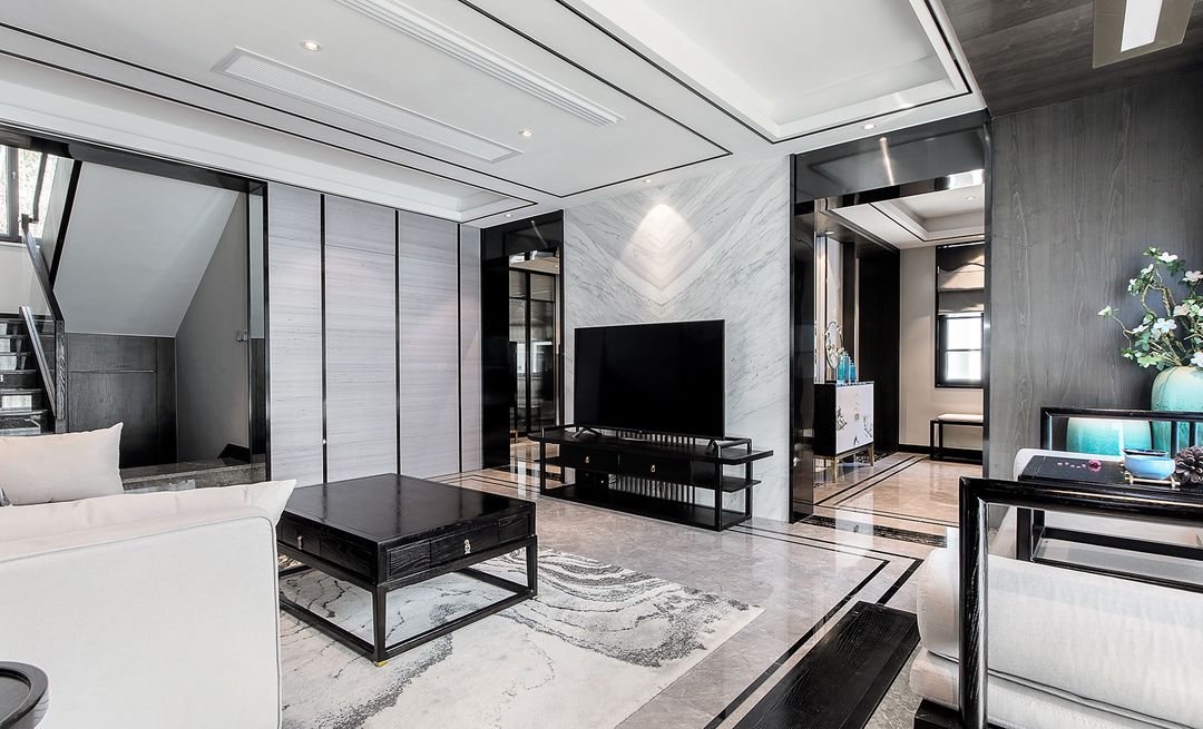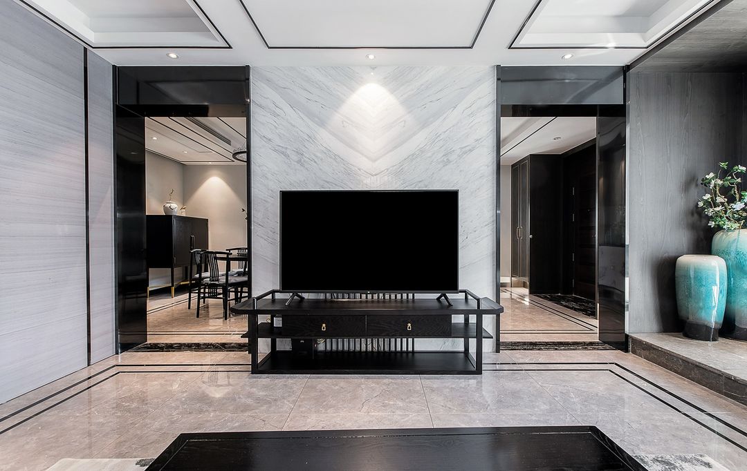 电视背景墙是整面的大理石。电视两侧一个门洞通往餐厅,一个门洞通往玄关。门洞用黑色不锈钢做门套自然的做了分隔。