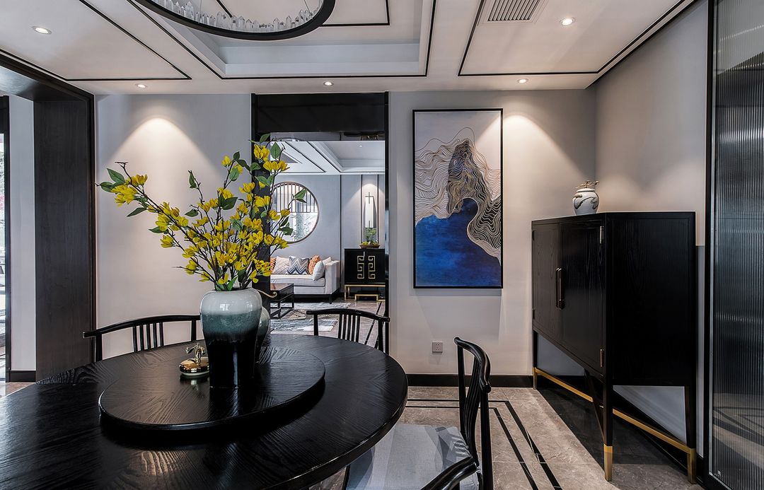 餐厅做成了中式的围合感。有门洞可以通往玄关,门套和餐厅电视背景做成统一KD板,点缀镜面。