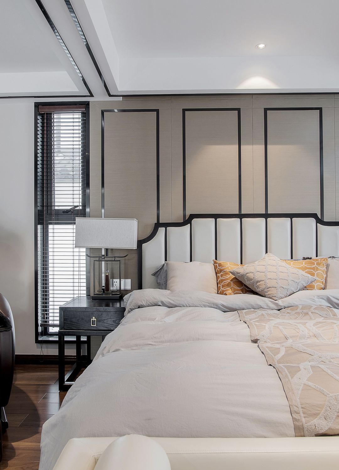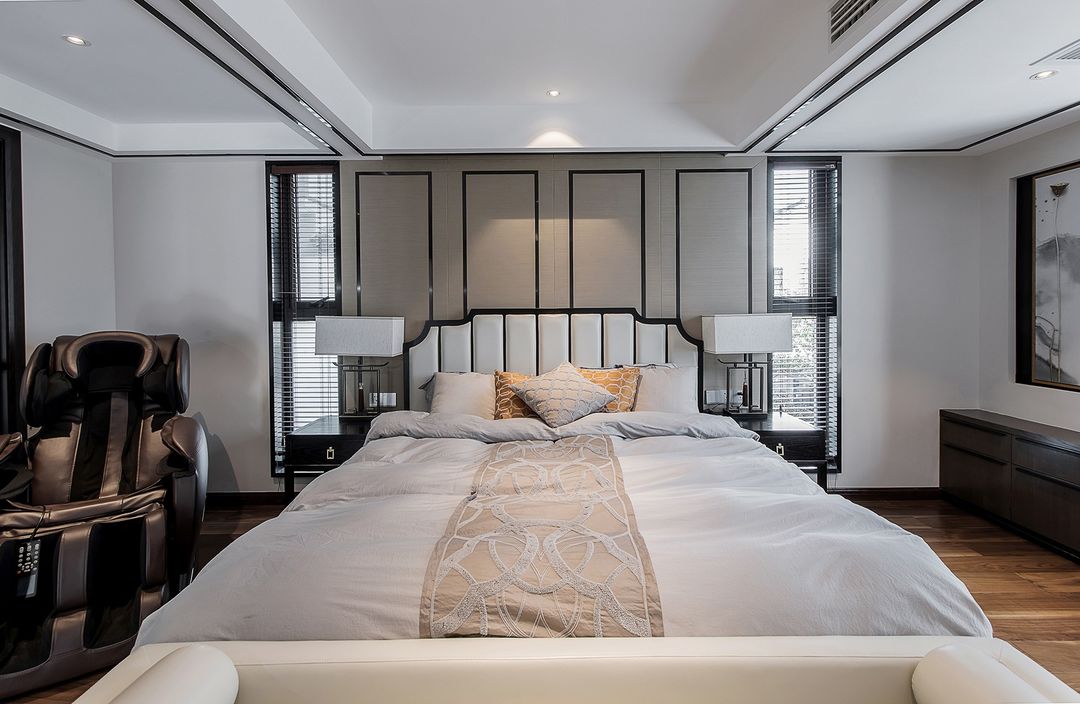 主卧床两侧开了造型的窗洞,用不锈钢做了窗套,既有采光又有造型感。