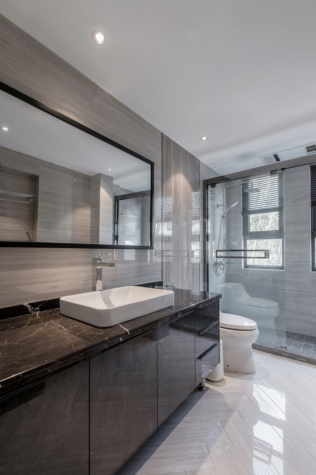 主卧卫生间还是走的简约风,在地砖的铺设上采用了人字铺。