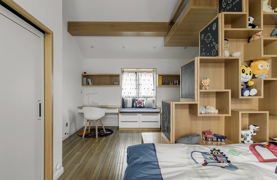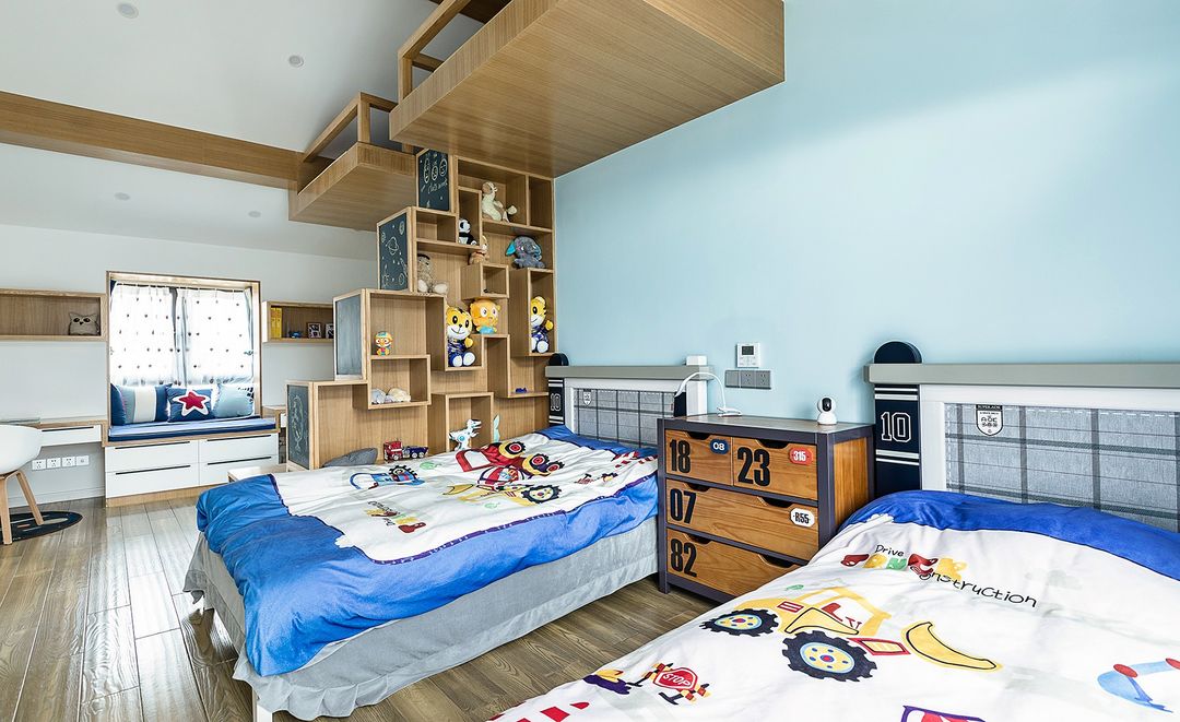 双胞胎房间更加注重的是趣味性,房间用趣味书柜做了隔断,分成了休息区和学习区,因为阁楼的层高较高,还做了小阁楼的设计