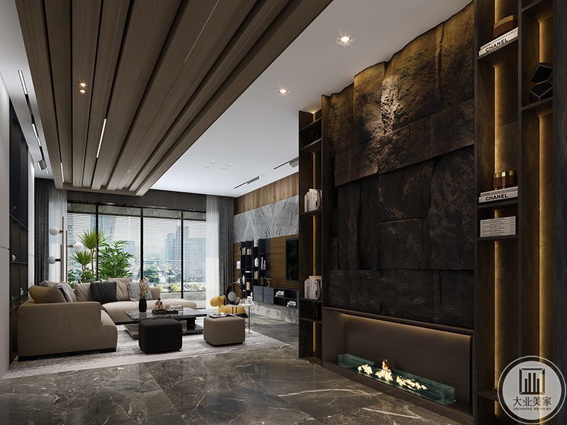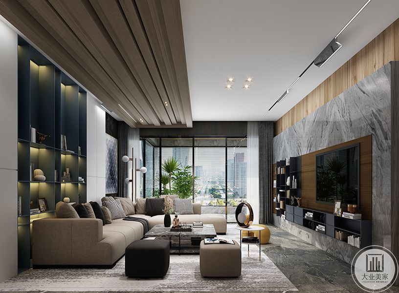 电视背景墙木饰面加大理石瓷砖铺贴,沙发背景墙定制展示柜,黑白纹地毯搭配浅棕色沙发