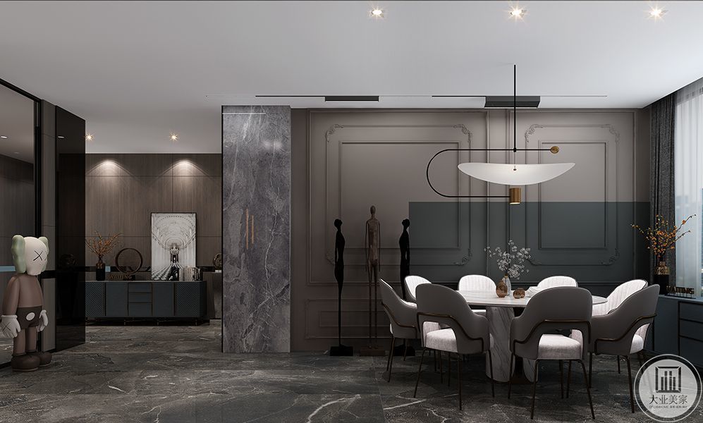 德基世贸一号餐厅1,8人圆桌,地面灰色大理石铺贴搭配白色桌椅,墙体一侧人物雕塑