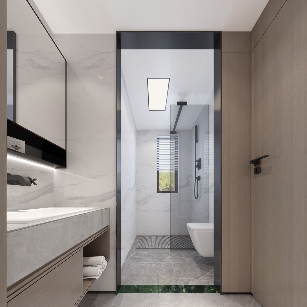 卫生间的空间不大,为了能够干湿分区,设计师将洗脸台挪到外面,这样的设计也让 卫生间的空间更开阔,也方便客户后期的使用。