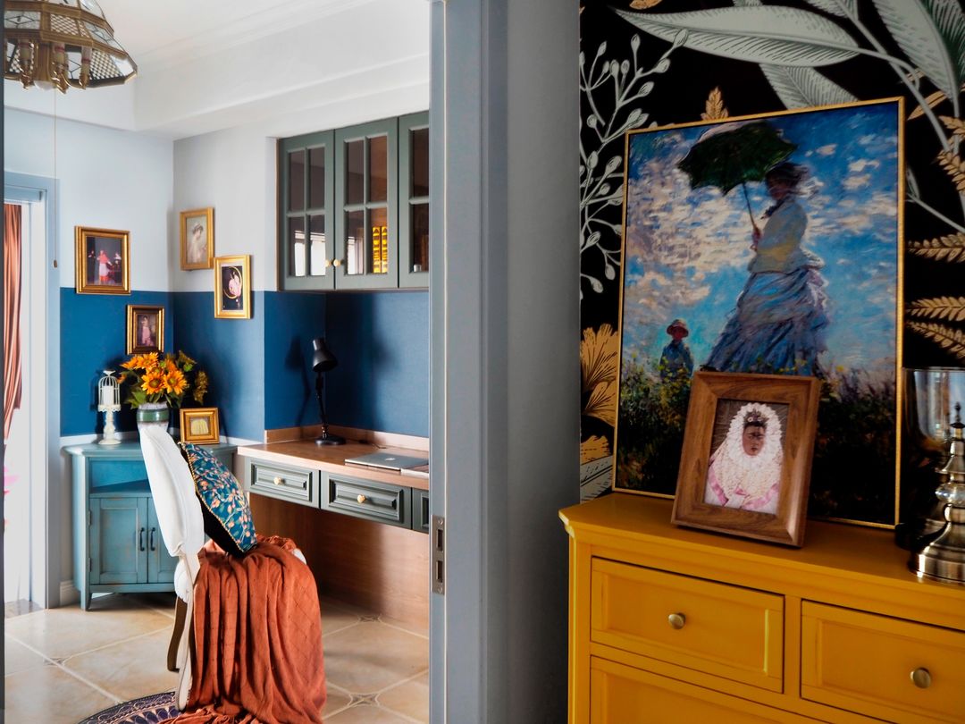 蓝色会给人在视觉上有冷静和放松感,搭配木质元素的书桌台面,也是再惬意不过了,绵柔的毯子,浓郁气息的深色地毯,奶油色的椅子,和复古的三角柜,让精致的灰蓝色更加的出挑,再搭配一些可爱精致的画作,有轻奢复古质感的灯,让整个空间多了几分家居生活的艺术感,也会让人想要在这样的环境里伏案写作,让回到家的疲惫身躯还能再为生活去工作和奋斗;