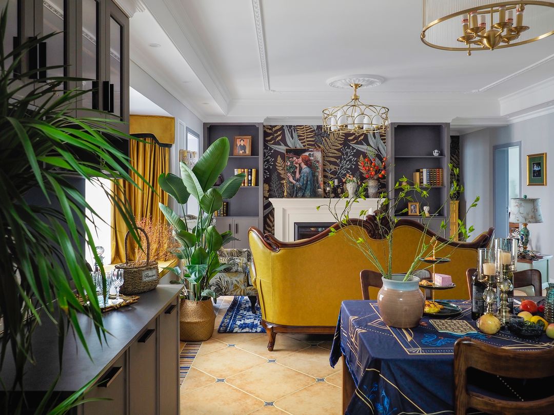 姜黄色的复古风沙发搭配纹理丰富的蓝色地毯,形成色彩的冷暖平衡,电视墙的流线型壁炉在冬日里静静升温,植物在沙发与窗帘之间很好的过渡了姜黄色的热情,如果是在静怡的午夜,一杯红酒一本情怀书籍,涌入包裹性很棒,有踏实感的老虎椅子,享受夜晚带来的宁静,体会岁月静好,这不就是我们需要的生活吗?