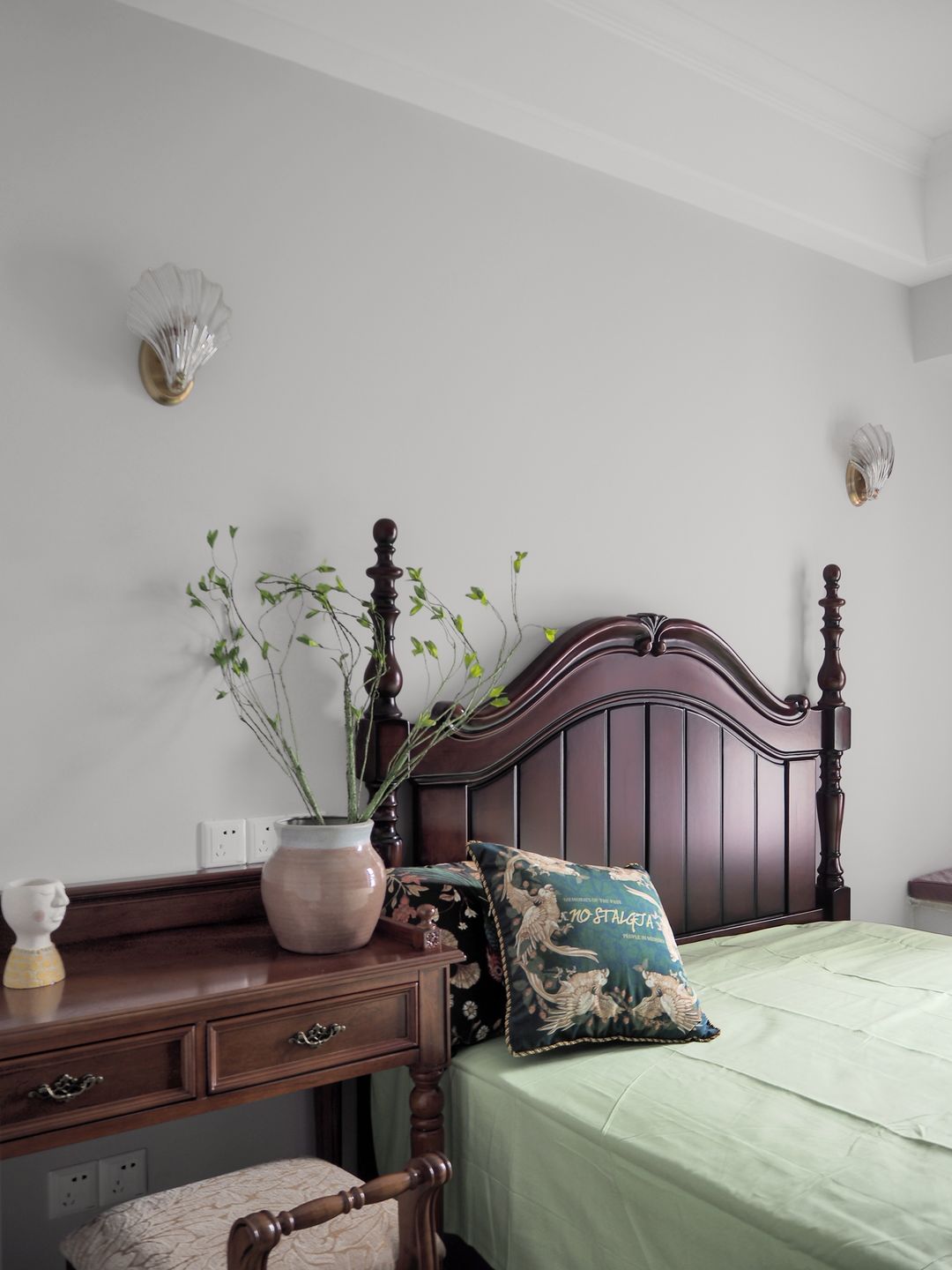 果绿色的清新毯子,让棕色的床面变得生趣很多,灰色的墙面没有过分炫耀的争宠,搭配贝壳壁灯,和绿色干枝,倒也是形成了一副干净美的空间