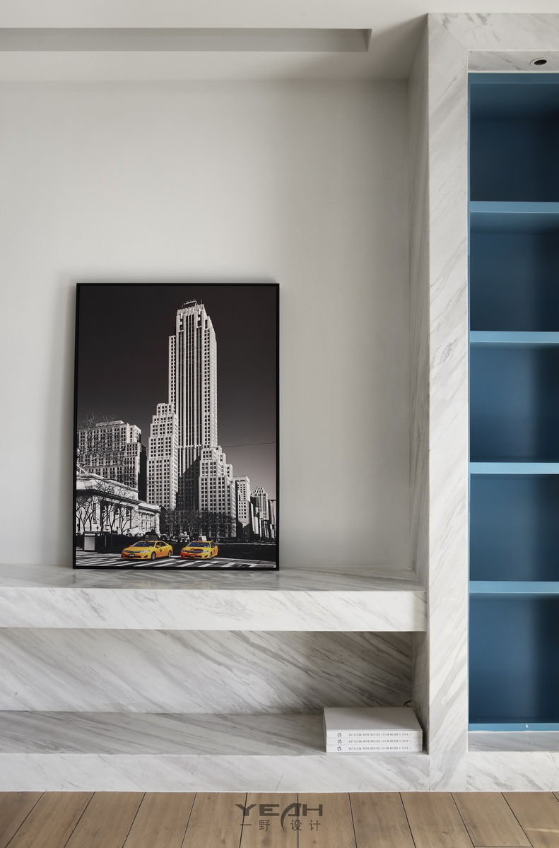配以纯净的白色跳跃的蓝创造出一个宁静而丰富的室内空间