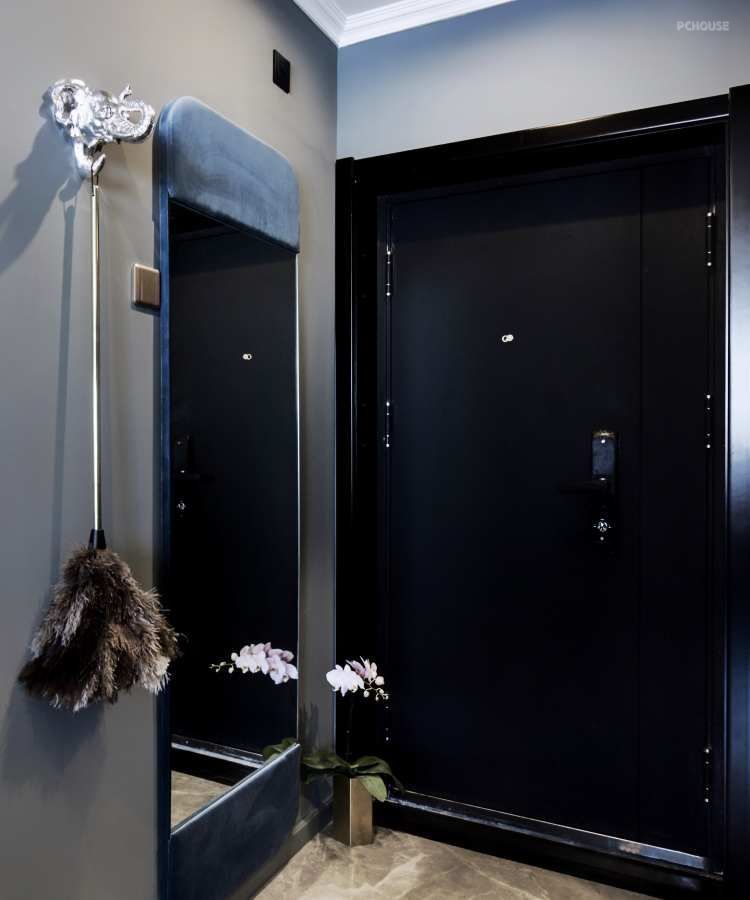 我们在玄关、客厅、走廊相互衔接的三个区域选用了当下流行的灰蓝色作为墙漆,并在不同的墙面调和不同的灰度做区分