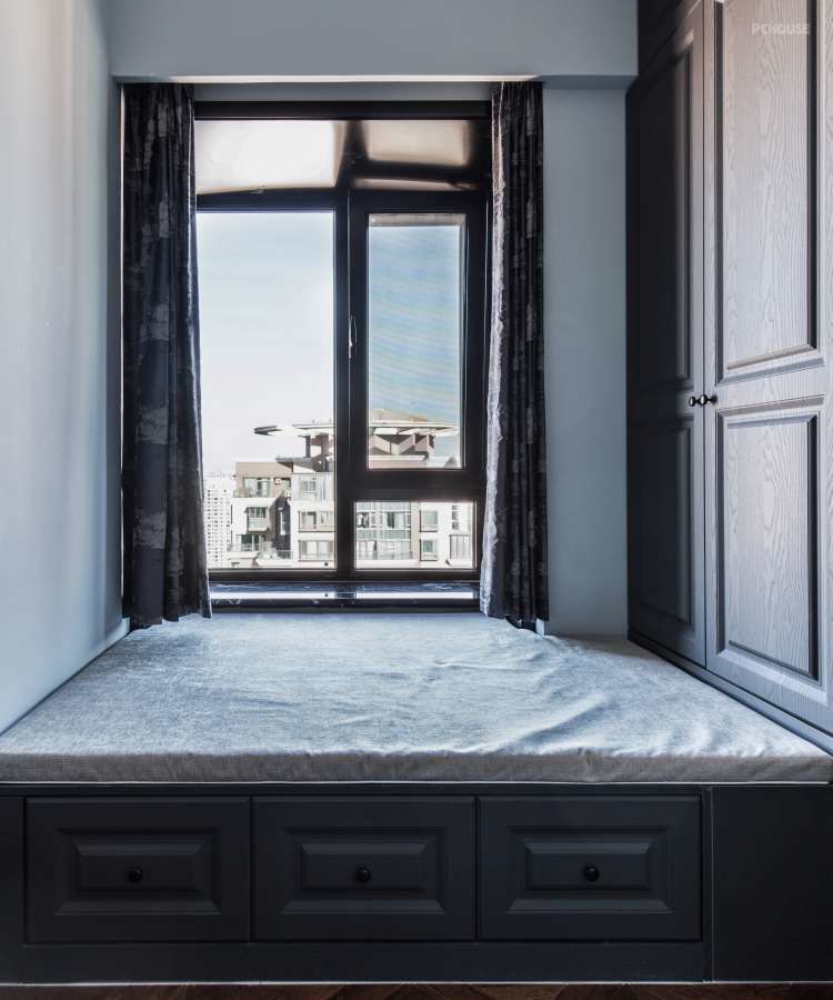 主卧依然使用了较深的色调,丝绒断面的窗帘和深色墙面一起营造出舒适的就寝氛围。