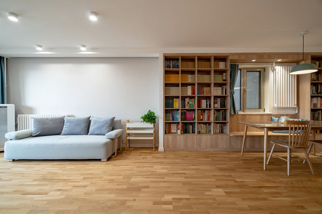 跨度5400mm的餐厅工作区,成为生活空间不可或缺的功能混合载体。高度450mm的部分,一并和卡座结合成为箱体收纳。以上部分的南北两侧宽度各有1650mm,做成了开放格书架,满足屋主如图书馆藏书的需求量。
