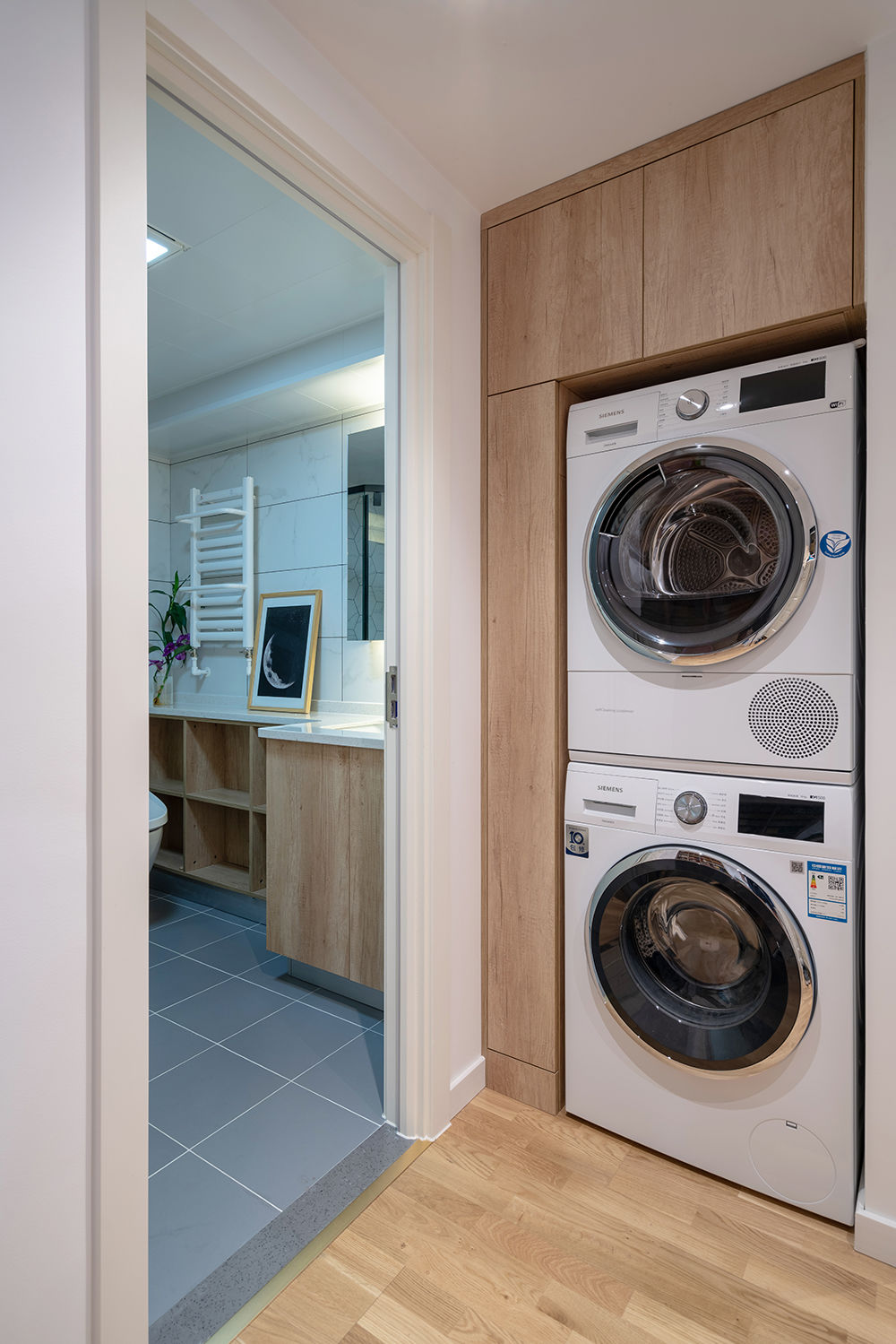原本客卫面积很大,改变动线后,卫生间被压缩向里,将洗衣机和烘干机安置到了外面。侧柜门和吊柜没有任何把手,体现空间完整性,不仅方便洗衣用品,脏衣袋,衣架的存放,还可以遮挡所有容易裸露在外的上下水管。