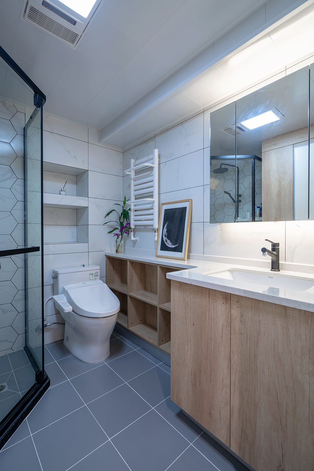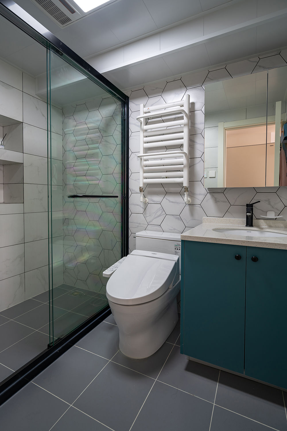 洗手台设置的转角,延伸了一段1450mm的矮柜格子,便于摆放纸巾和清洁物品,也方便打理。淋浴房的六角砖和长条亚光砖自由衔接,颜值不低,效果反倒更自然有意思。