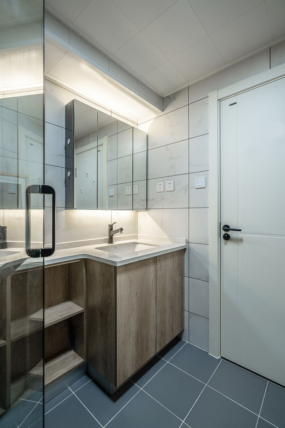 镜柜让整体布置看上去更加通透敞亮,上下的照明光源,让人不必再纠结镜前灯尺寸和样式的选择。厚度150mm足够满足洗漱用具的摆放,告别难看的置物架。