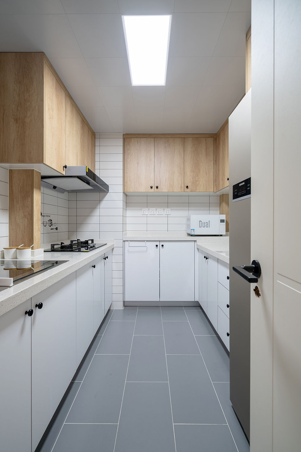 餐厅对面配备了一段1800mm的端景作为配餐柜,让不大的厨房,解锁更多餐具的摆放空间。整体风格以北欧为主,大量的原木家具让空间氛围变得十分温馨。满足采光的同时,无主灯的设计在层高只有2600mm的家庭来说,也会让空间无压迫感,看起来更加宽敞。