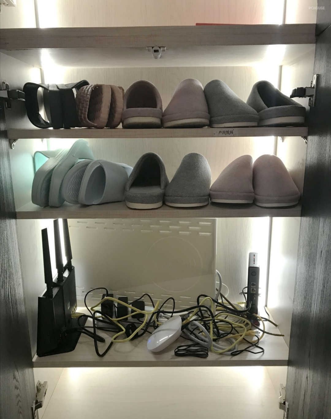 在设计阶段,需要沟通好使用者的鞋子款式和数量,方便计算每个层板的高度,最大化的满足不同款型鞋的收纳。蓝色是弱电箱位置,绿色是强电箱,提前算好柜内结构的位置,避开层板和竖板。#玄关 #鞋柜 #收纳 #柜子 #木地板 #感应灯带