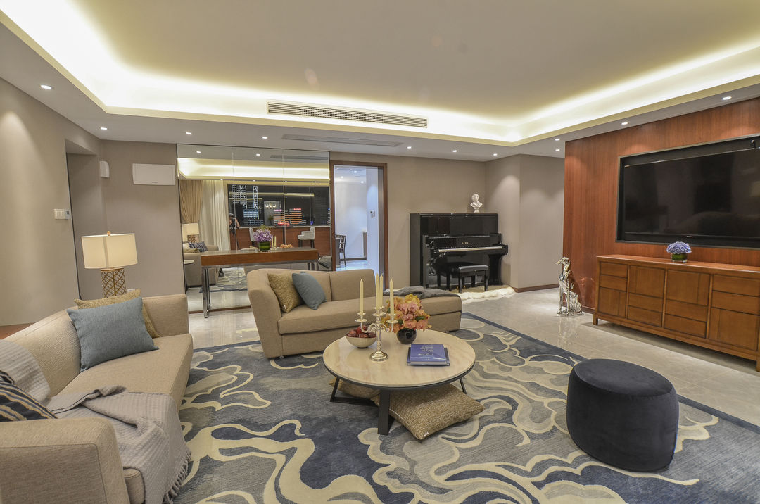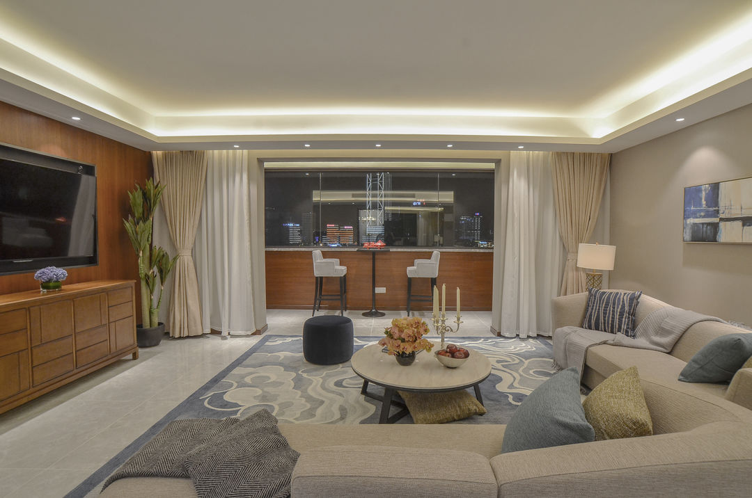 客厅的设计化繁为简,顶部无主灯,通过点光源,线性光源来营造明亮、温馨、细腻的空间情绪。大面积的块毯提升空间舒适柔和的氛围。
