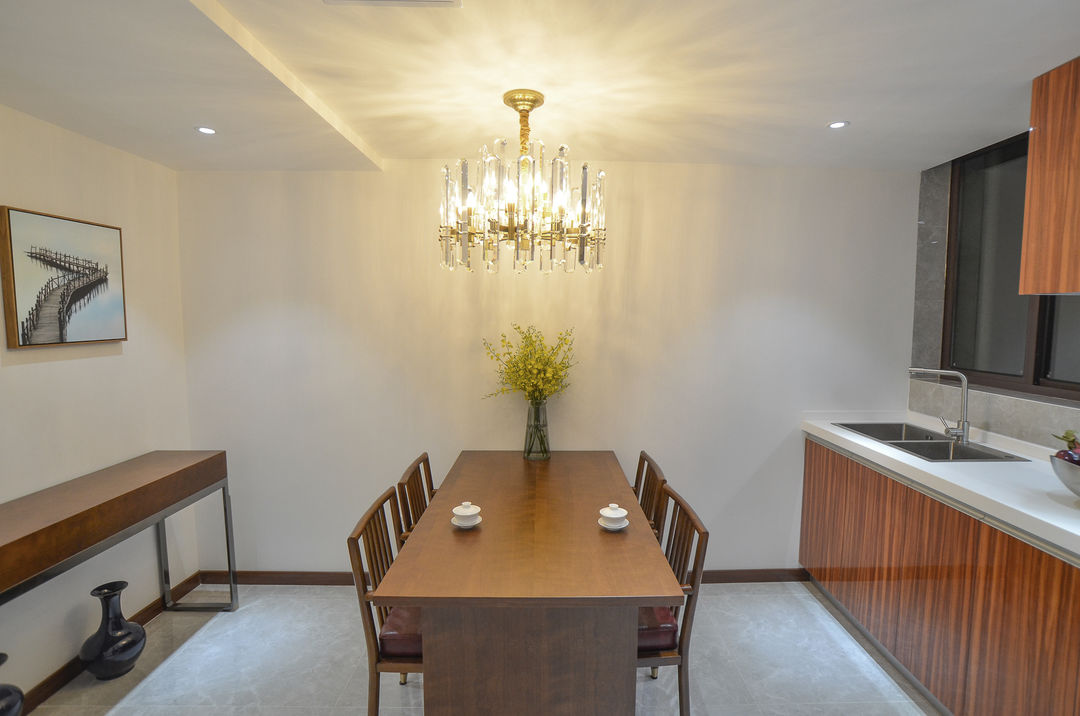 厨房和餐厅设计成为一体,屋主其实烧饭很少,所以保留基础的操作功能即可。厨房是没有门的,通过门洞可以直接看到阳台的窗外景色。