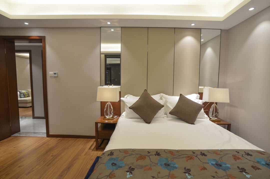 主卧套房,配有奢华景观阳台,衣帽间,独立卫浴。色调与整体一致,浓浓的酒店既视感。没错,这就是屋主想要的酒店般的整洁,尽然有序。装饰性的硬包与镜面,始终保持优雅的格调,素雅平和又不失精致。