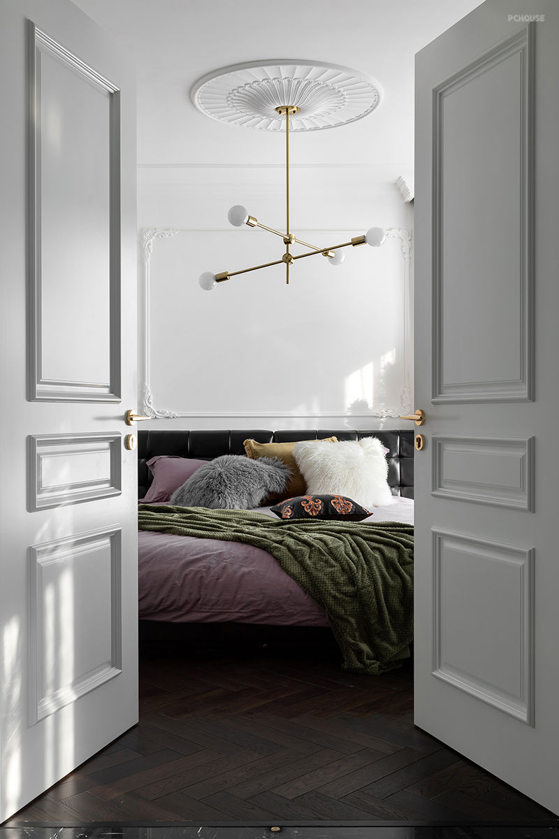 主卧的双开门增强仪式感,也最大限度的打开了客厅和主卧的互动性,两者之间主体家具轴线对称的形式。