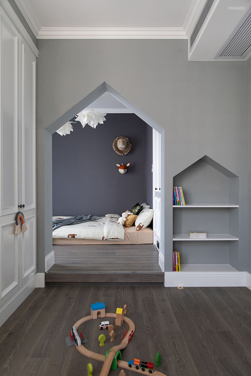 最后一个空间改造点在朝北朝东的两个小房间。 设计师把两个小空间打通,空间都留给小孩房。在这块区域里做了动静分区,朝东房间抬高,做睡眠区域,床垫放一张在地台上.趣味十足;朝北的房间就是活动玩耍做功课的空间.两个小空间不再做封闭式的门,门洞造型会给小孩房增加很多趣味性。