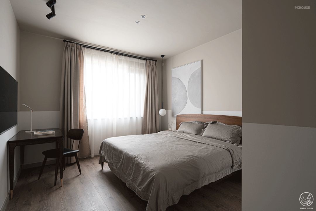 简约的卧室里,没有多余的家具,我们仅将一床、一桌、一灯、一椅、一柜简单融入浅灰色与白色拼色的墙面和温暖的棕色地板氛围之中,通过灰色、棕色和白色之间的碰撞,一本杂志,一杯咖啡,营造出温暖而又含蓄,理性而又温情的休息氛围。