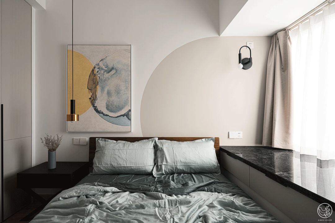 次卧因是父母居住,整体色调以白色为主,床头做了一个沙色的弧形拼色,搭配略为跳跃的水墨画,到顶的衣柜,简约又温暖。同时,为增加收纳空间,我们在飘窗处特意设计了一排抽屉柜。