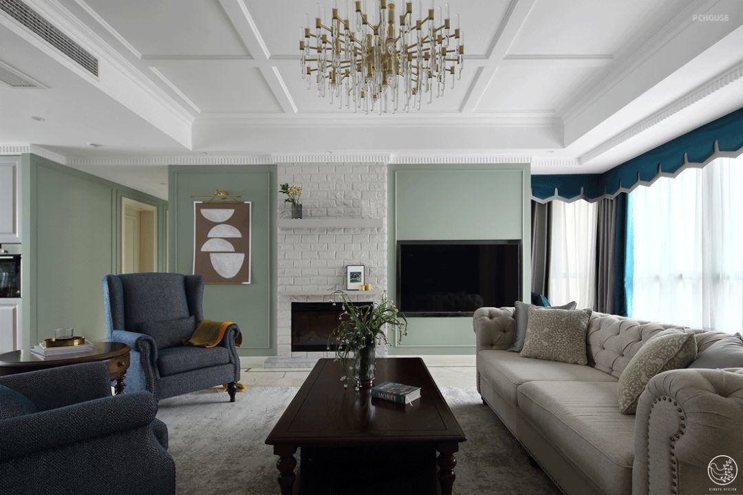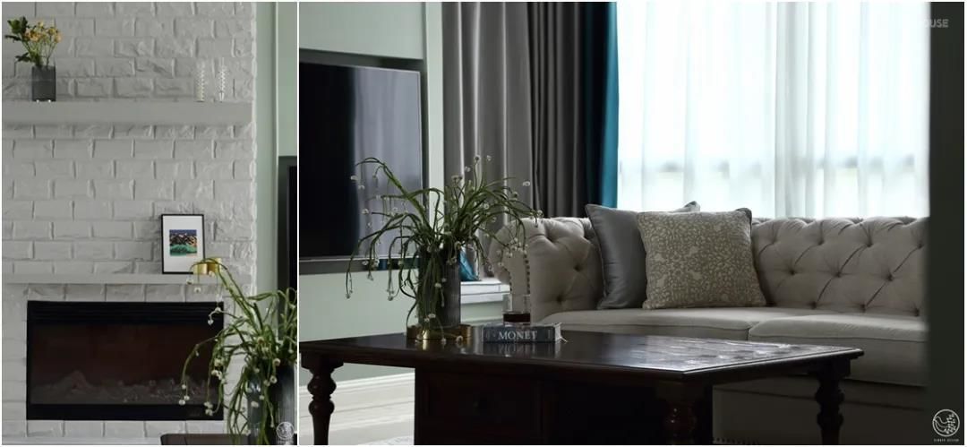 因为Joan不期望将电视挂在壁炉之上,于是我们打破常规,以绿豆灰与白色从视觉及功能上分隔开了电视墙与壁炉。而银灰色的窗帘,则在壁炉映出温暖火光时,将原本清新、轻盈的氛围承托出温暖的归宿感。